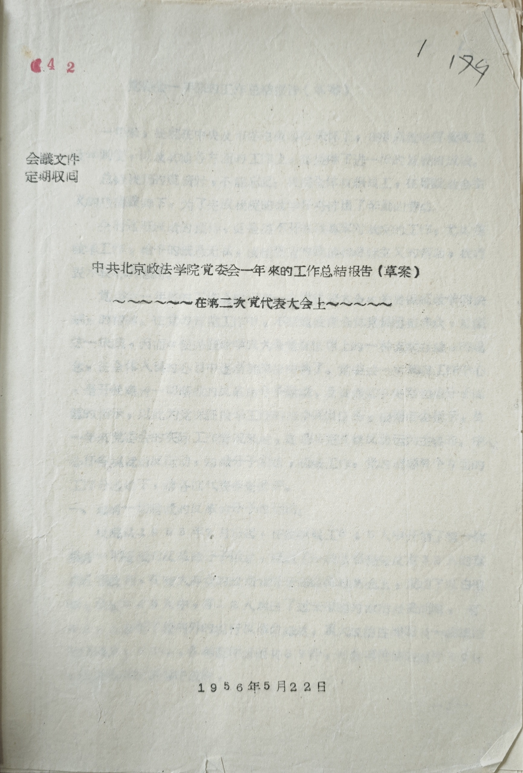 为了认真贯彻党中央知识分子会议精神,加强党的领导,进一步推动师资培养工作,1956年5月25日,中国共产党北京政法学院第二次代表大会开幕。
