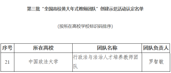 近日,根据教育部公示,我校罗智敏教授担任负责人的“行政法与法治人才培养教师团队”被认定为第三批“全国高校黄大年式教师团队”,雷磊教授担任负责人的“习近平法治思想教师团队”入围第四批“全国高校黄大年式教师团队”创建示范活动。